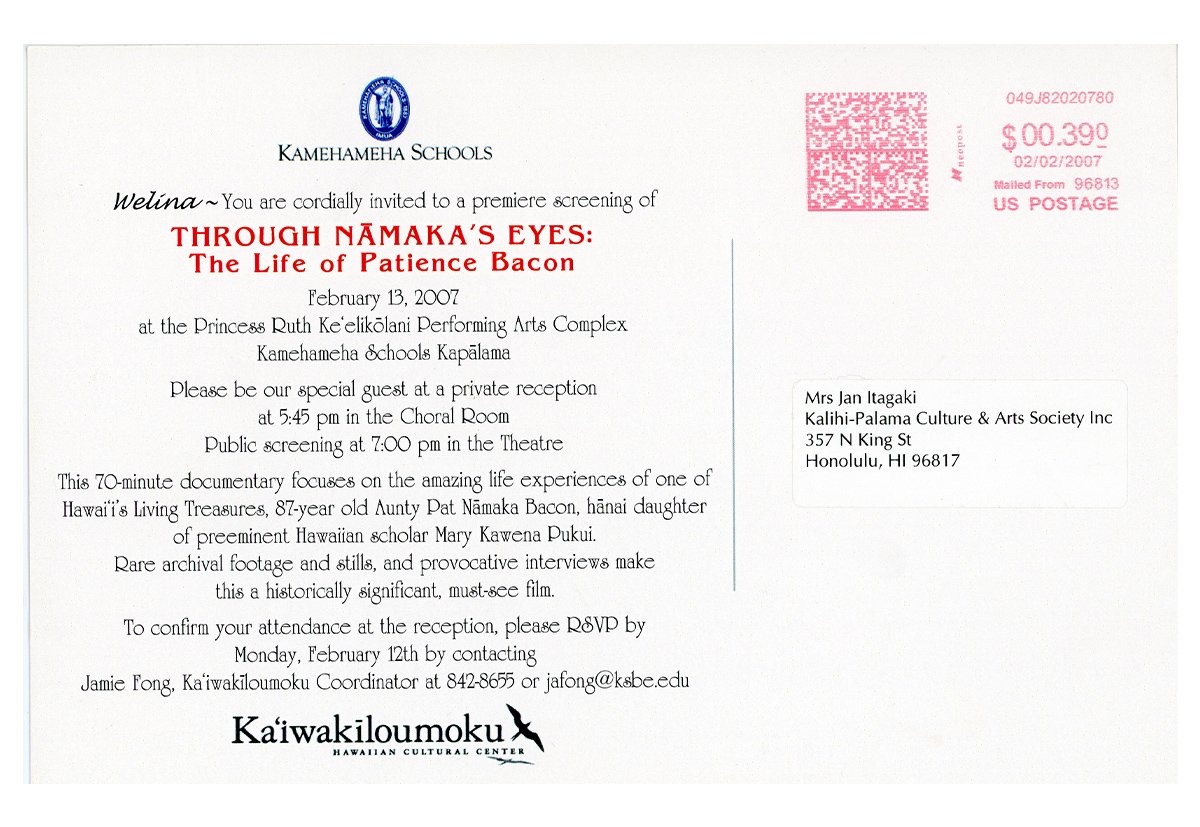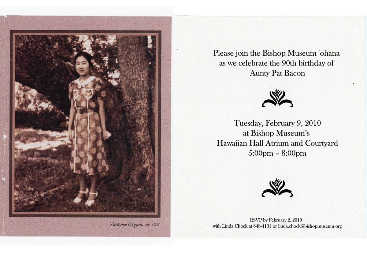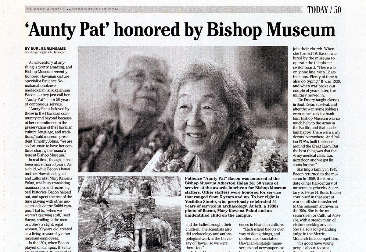 Aunty Pat offered herself to the rigorous work of preservation, bringing joy and insight to those who shared with her in this endeavor. To her compatriots in and outside the Museum, she was also a confidante, an unwavering source of support, comfort, and wisdom. BISHOP MUSEUM