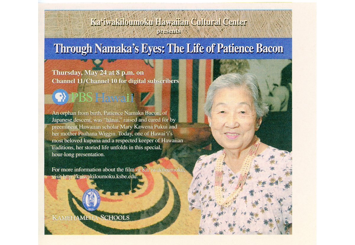 Pat Nāmaka Bacon is featured in Book One of the Nānā I Nā Loea. Her interviews for the Resource Book was recorded on Jan 27, 1982 and Kalihi-Pālama Culture & Arts Society is still in possession of those original cassette tapes used to record her leo / voice.